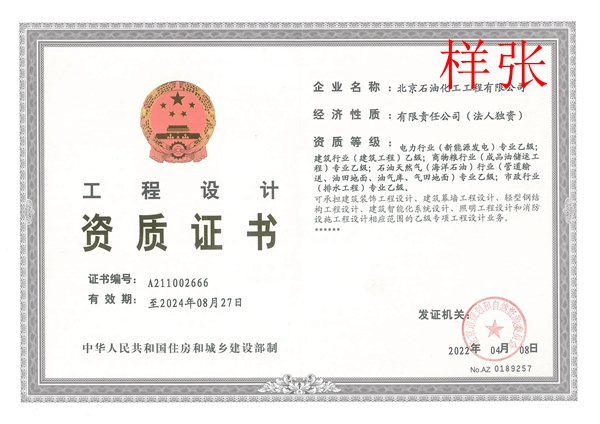 電力行業(yè)(新能源發(fā)電)專業(yè)乙級;建筑行業(yè)(建筑工程)乙級;商務(wù)糧行業(yè)(成品油儲運(yùn)工程)專業(yè)乙級;石油天然氣(海洋石油)行業(yè)(管道輸送、油田地面、油氣庫)專業(yè)乙級;市政行業(yè)(排水工程)專業(yè)乙級。