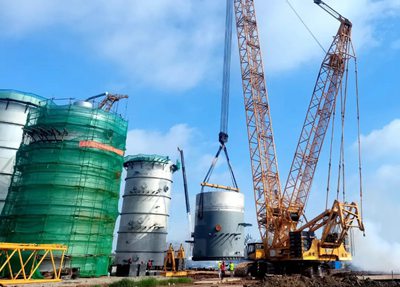 目前,DMC裝置主框架鋼結(jié)構(gòu)開始安裝,同時(shí)一塔、三塔下段裙座已吊裝就位。兩塔直徑均為8米,高度分別為66.08米和66.7米,重量為455噸和411噸,此次吊裝采用600噸履帶吊,分四段制造及四段吊裝。 為確保順利吊裝,業(yè)主、監(jiān)理、總包、施工單位召開多次吊裝專題會,結(jié)合場地實(shí)際情況,研討制定吊裝方案,嚴(yán)格按照操作要求進(jìn)行施工。在各方人員密切配合下,高質(zhì)量完成了本次吊裝任務(wù)。